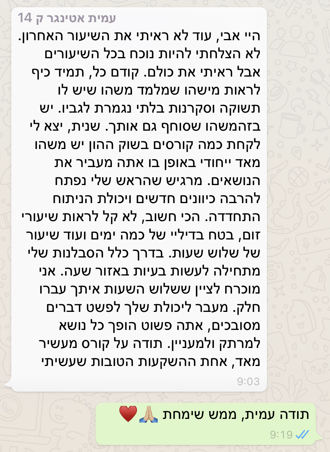 מעבר לשעות ההכשרה אנחנו נהיה זמינים בוואטסאפ קבוצתי שייפתח לטובת הקורס.