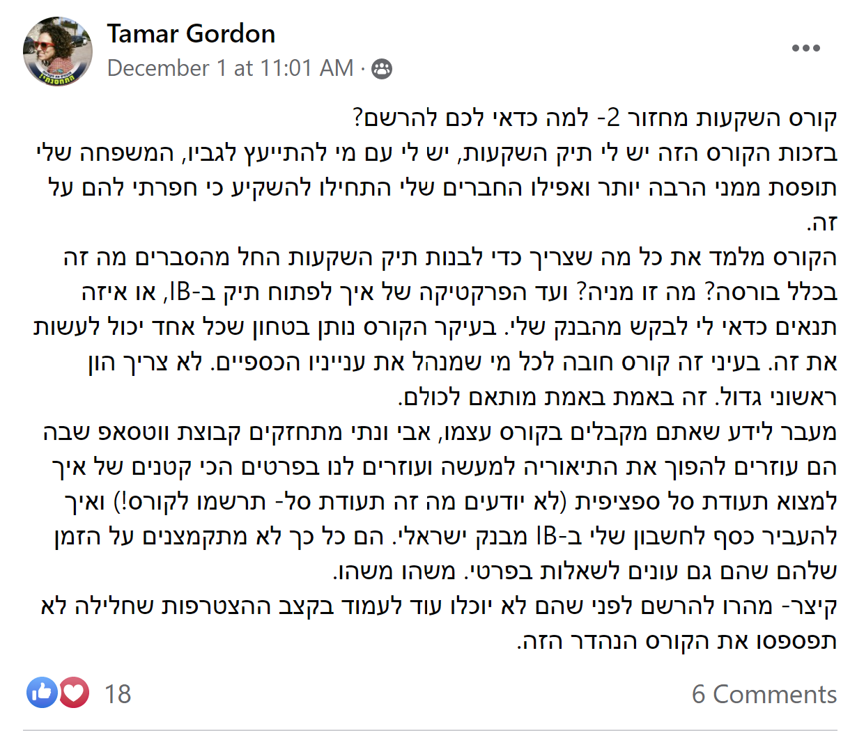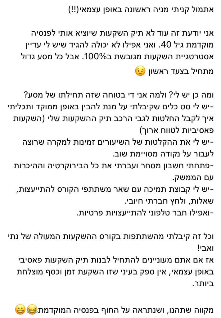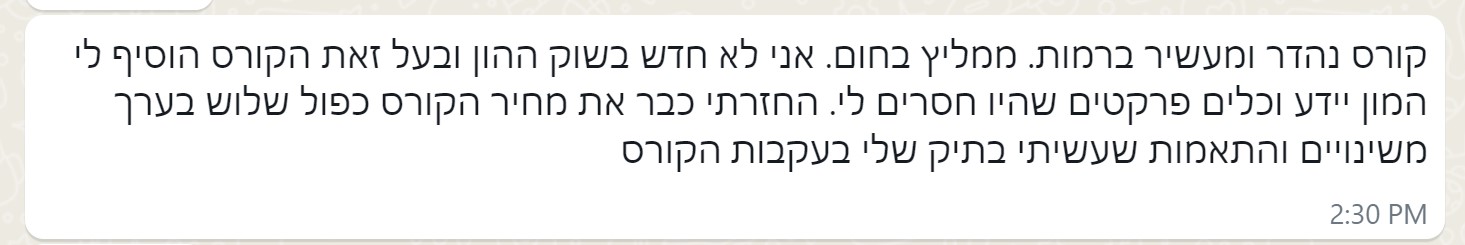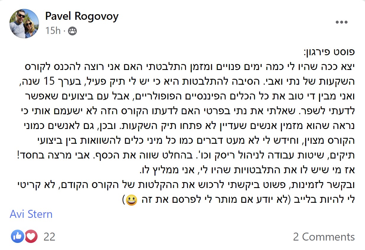 את הקורס הזה העברנו ליותר מ 2000 בוגרים, שרבים מהם מיישמים את הכלים שלמדו בקורס ומנהלים לעצמם תיק השקעות.