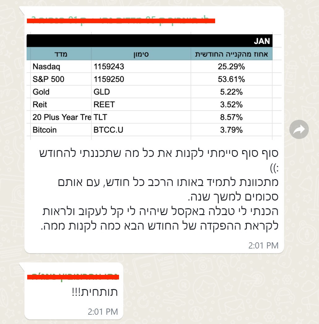את התיק אתם הולכים לבנות באמצעות שילוב של index funds או מוצרי סל אחרים (נסביר זאת בהרחבה בקורס). אתם גם תלמדו איך לעשות זאת בפועל, כולל פתיחת חשבון המסחר וביצוע הפעולות השוטפות לניהול התיק.